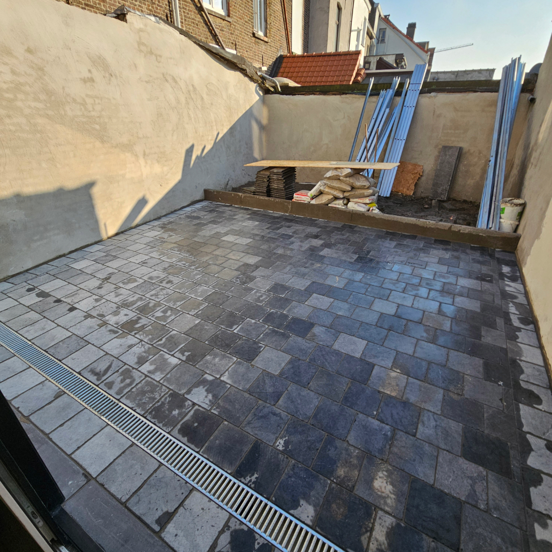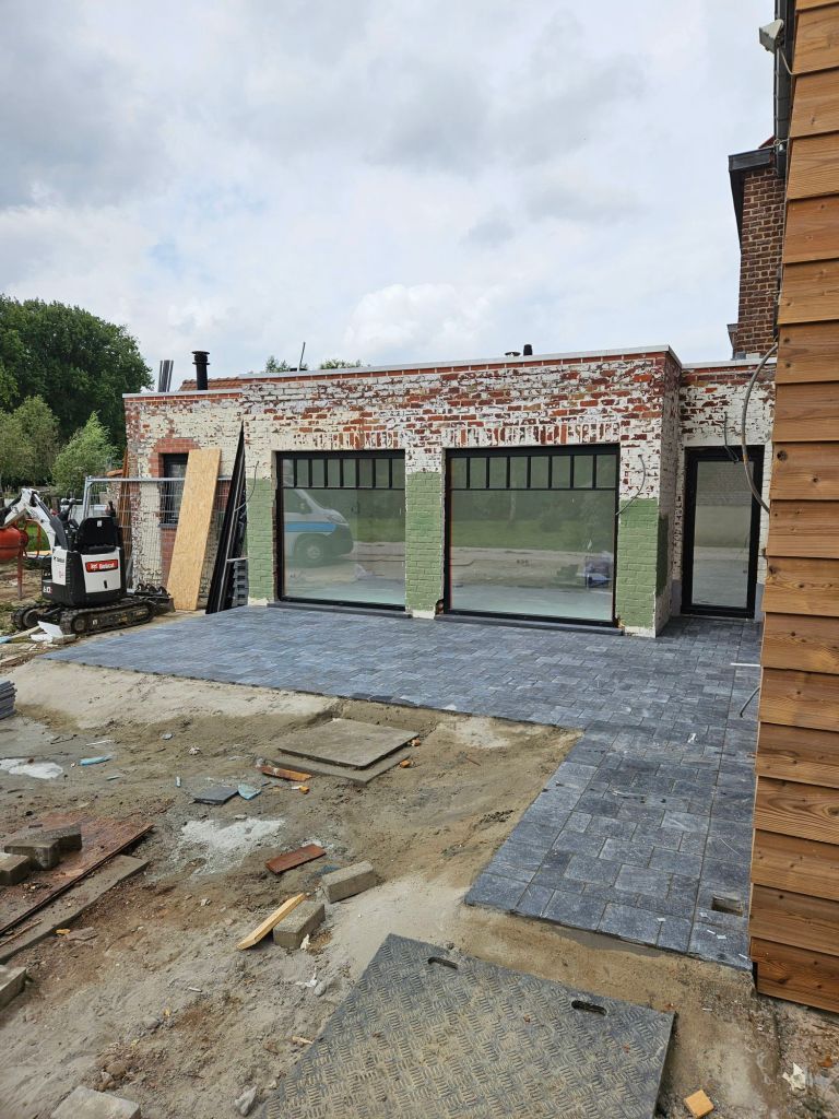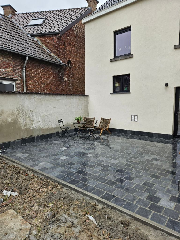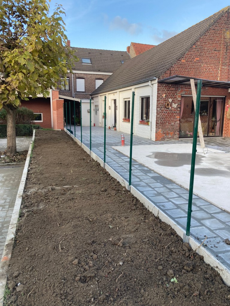 - Verhardingswerken: Het aanleggen van een nieuw terras, oprit en tuinpaden, waarbij we zorgen voor een duurzame fundering en een perfecte afwatering.